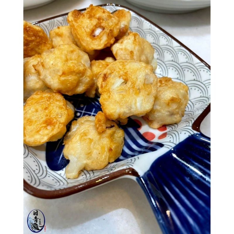 1.首先將花枝丸對切,這樣不只容易熟透 對於小小孩要吃也相當方便 2.接著裹上蛋液,再丟入油鍋 油就不會噴得到處都是囉